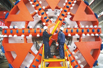 今年以來,濟南重工集團有限公司打造以軌道交通裝備產業為核心的智能制造與高端裝備產業園,重點發展全斷面隧道掘進機、隧道掘進專用裝備、裝配式建材生產線等產品領域,老國企煥發出勃勃生機。圖為工人在查看即將完工的盾構機刀盤。張進剛攝(人民視覺)