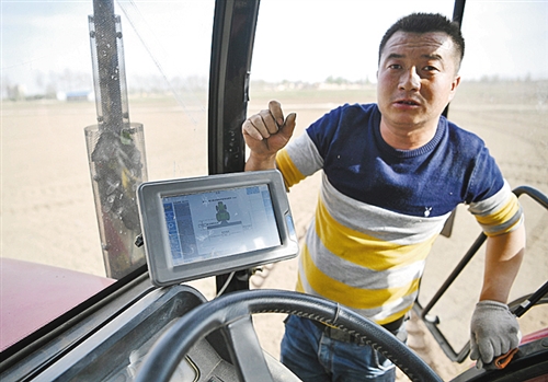 寧夏吳忠市利通區金積鎮塔灣村村民介紹裝在拖拉機上的北斗導航系統。(王鵬攝)
