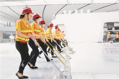 6月18日,北京大興國際機場整體開荒保潔工作全面開始,圖為保潔員在航站樓4層集結就位。