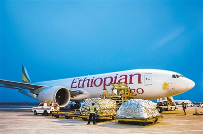 執飛非洲全貨機定期航線的飛機在重慶江北國際機場上裝卸貨物。(新華社記者 劉 潺攝)