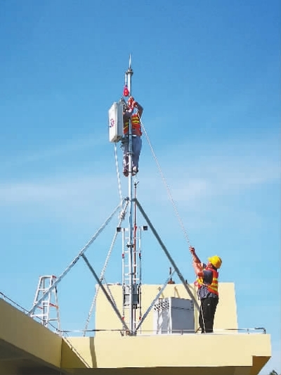 圖為中國電信海南公司一線員工在海南省三沙市部署5G通信設備。7月24日,三沙永暑礁、永興島雙雙開通5G基站。(中國電信供圖)