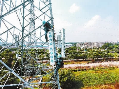 近日,工程施工人員在廣東東莞市麻涌鎮的電力塔上安裝5G通信設備。(中國鐵塔供圖)