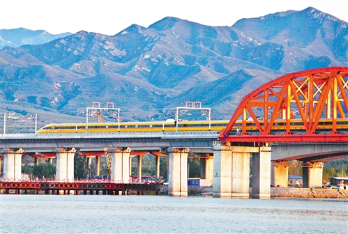 京張高鐵目前正在進行緊張的聯調聯試。圖為列車快速行駛在官廳水庫大橋。(中經視覺 王 軍攝)