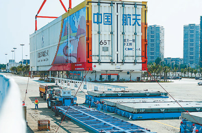 圖為長征五號B遙一運載火箭產品集裝箱離開清瀾港碼頭前往文昌航天發射場。(影像中國 亓 創攝)