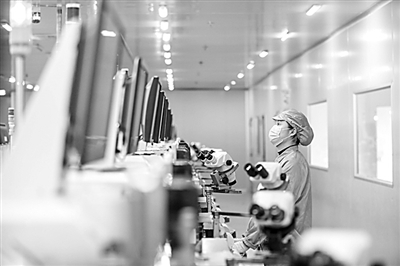 四川省遂寧市經開區藍彩電子智能信息化車間,工人正在生產線開足馬力加緊生產。