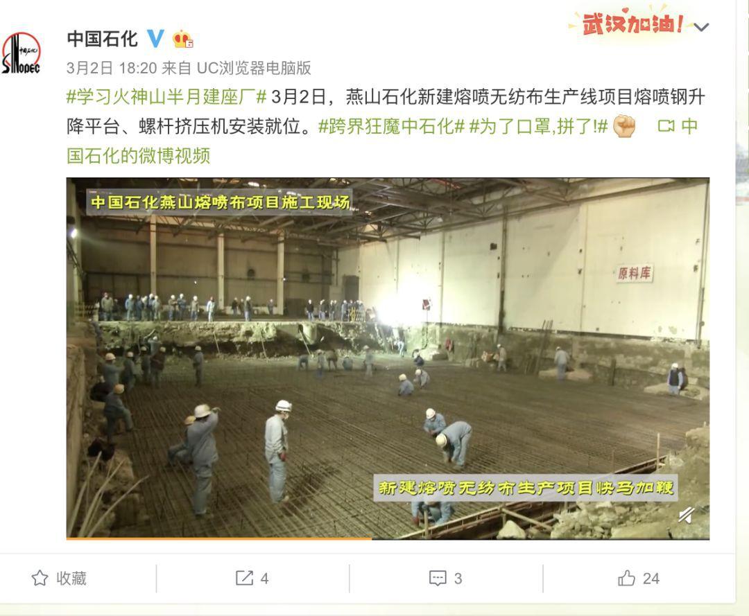 面對(dui)急增的(de)需求(qiu)和口罩原材料短缺的(de)矛盾,央企紛紛“跨界護(hu)盤(pan)”。2月24日,中(zhong)石化(hua)宣(xuan)布,投資約2億元,在(zai)北京(jing)燕(yan)山(shan)石化(hua)和江蘇儀征化(hua)纖快馬加鞭建(jian)設10條熔(rong)噴布生產線。