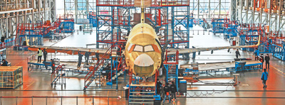 3月6日,工人在(zai)中國商飛(fei)上海飛(fei)機(ji)制造有限公(gong)司(si)的生產車間(jian)內作業。新華社記(ji)者 丁汀攝