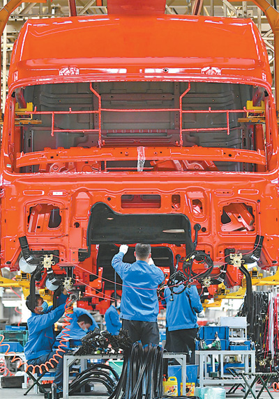 4月23日,工人在(zai)陜西(xi)汽車控股集團有限公司重卡總裝線工作。新華社記者 張博(bo)文攝