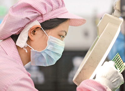 3月31日,在(zai)中國信科集團烽火通信公司系(xi)統設備(bei)制造部的5G智造車間(jian),工人正(zheng)在(zai)生產相關設備(bei)。人民日報記者 李舸攝(she)
