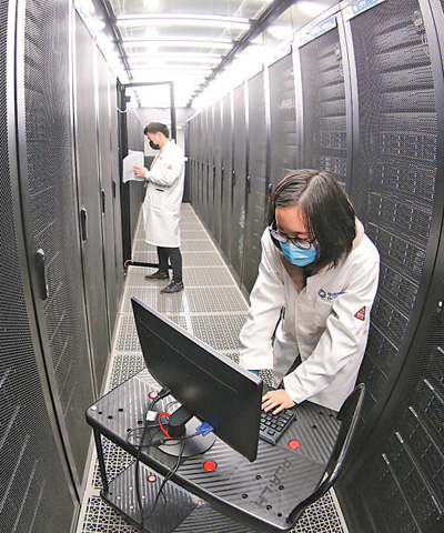 3月24日,中(zhong)國移動(襄(xiang)陽(yang))數據(ju)中(zhong)心,網(wang)絡工(gong)程師在新型綠(lv)色(se)倉儲式數據(ju)中(zhong)心進行網(wang)絡調試(shi)。王(wang)虎攝(人(ren)民視覺)