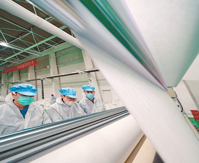 4月23日,燕山(shan)石化工人正在熔噴無紡布(bu)生產線上(shang)工作,該生產線僅用時12天就(jiu)建(jian)成投產。人民日報記者(zhe) 賀 勇攝
