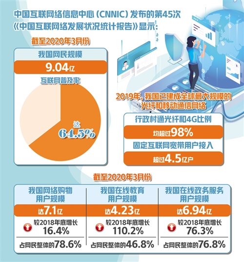 4月(yue)28日(ri),中國(guo)(guo)互(hu)(hu)聯(lian)網絡(luo)信息(xi)中心(CNNIC)發(fa)(fa)(fa)布的(de)第45次(ci)《中國(guo)(guo)互(hu)(hu)聯(lian)網絡(luo)發(fa)(fa)(fa)展(zhan)(zhan)狀況統計報告》(以下(xia)簡稱《報告》)顯示,截至3月(yue)份,我國(guo)(guo)網民規模為9.04億(yi),互(hu)(hu)聯(lian)網普及率達64.5%,龐大的(de)網民構成了(le)中國(guo)(guo)蓬勃發(fa)(fa)(fa)展(zhan)(zhan)的(de)消費市場(chang),也為數字經濟(ji)發(fa)(fa)(fa)展(zhan)(zhan)打下(xia)了(le)堅實的(de)用戶基礎。