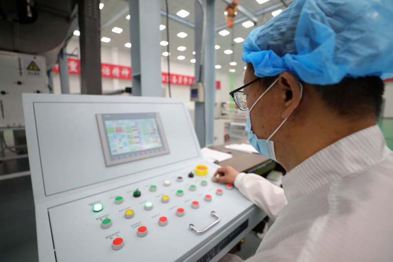 4月20日,工人在中國石油遼陽石化公司聚酯廠熔噴無紡布車間生產線上忙碌。