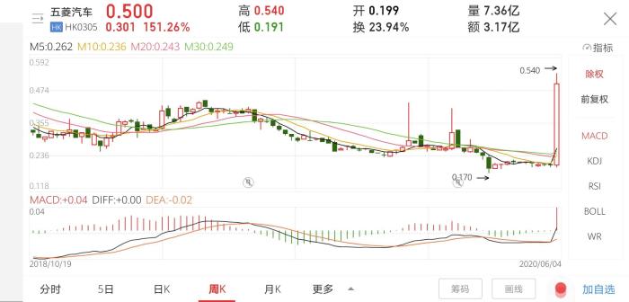 6月3日(ri),五菱“擺攤神車(che)”引爆(bao)朋友圈,并帶動五菱汽(qi)車(che)股價(jia)暴漲,盤中漲幅(fu)一度(du)達到120%。當日(ri),公司股價(jia)報(bao)收0.305港元(yuan)/股,漲幅(fu)53.27%,總市值(zhi)9.38億(yi)港元(yuan)。