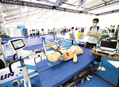 9月5日,觀眾在服貿會新松機器人展區觀看上下肢主被動康復訓練系統演示。