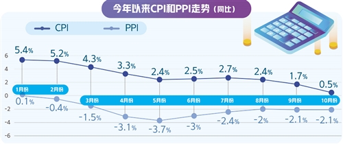 10月份,CPI同(tong)比(bi)(bi)上漲0.5%,漲幅(fu)比(bi)(bi)上月回落1.2個百分點,環比(bi)(bi)下降0.3%。