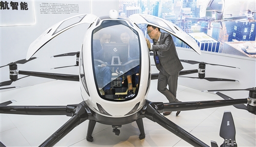 11月19日,在武漢舉辦的2020中國5G+工業互聯網成果展上,參觀者了解一臺自動駕駛飛行器。