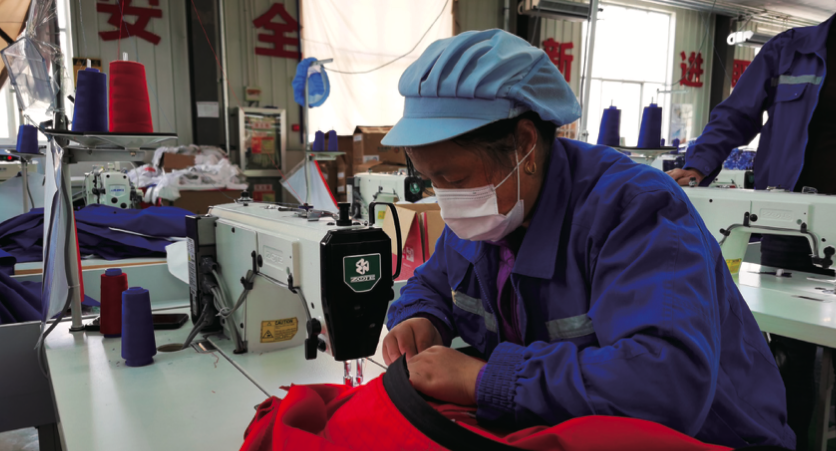 中國海油甘南扶貧車間為當地100多人解決了就業問題,讓貧困戶在家門口就能擁有穩定的收入。圖為操作工李娥娥正在縫制工服