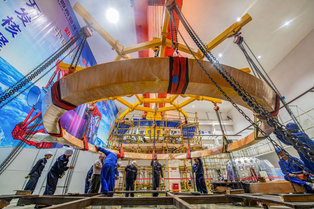 中核集團核工業西南物理研究院的工作人員在安裝調試中國環流器二號M裝置時起吊線圈。