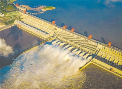圖為長江三峽水利樞紐工程開啟泄洪深孔泄洪。