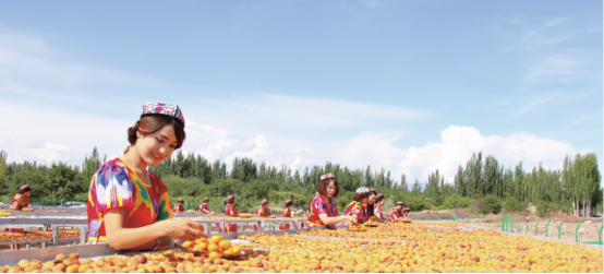 中國電信援建新疆疏附縣杏干自然晾曬場農戶晾曬杏干。
