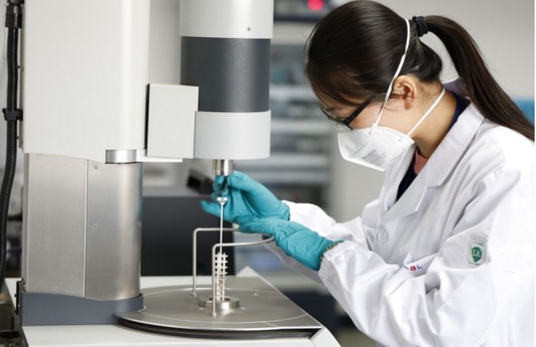 圖為科研人員正在對深水恒流變合成基鉆井液添加劑進行化驗分析