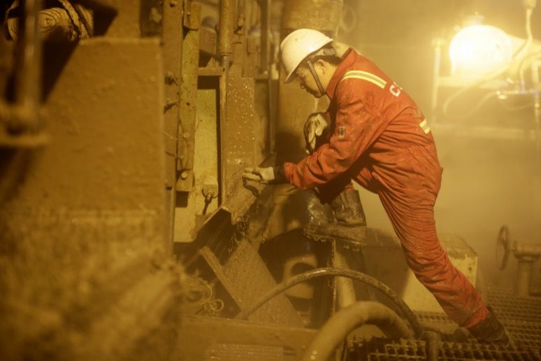 圖為作業人員在現場對深水恒流變合成基鉆井液進行檢查