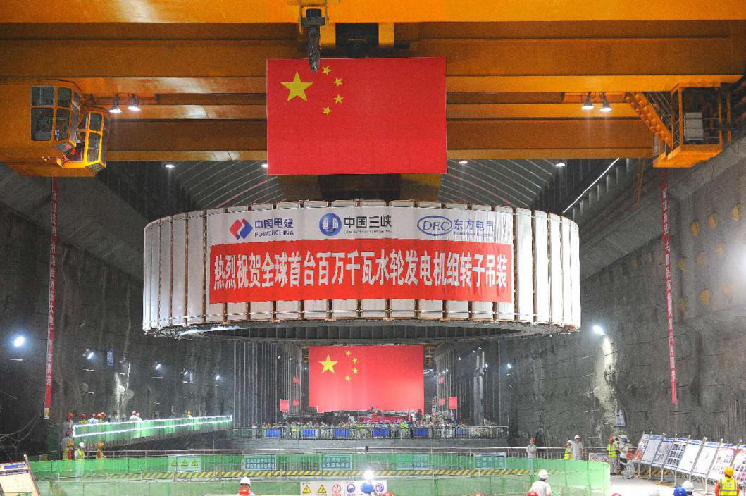 全球首臺百萬千瓦水輪發電機組轉子吊裝
