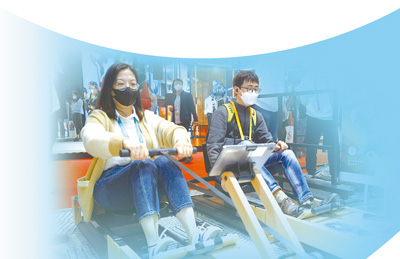 11月6日,在進博會消費品展區,觀眾正在體驗多功能劃船機。