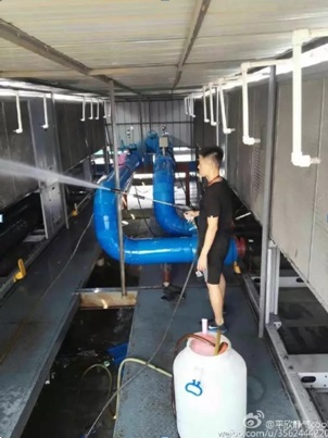 這里是青島聯通IDC機房。空調維(wei)護人員(yuan)盯著三十(shi)六七度(du)的高溫巡檢設備(bei),給散熱器(qi)噴水(shui)防(fang)“中暑(shu)”。