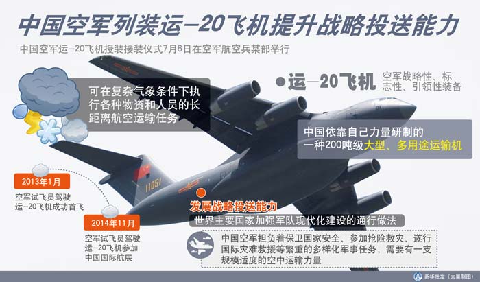 運-20列(lie)裝空軍(jun),標志著國(guo)(guo)家(jia)大型飛機重(zhong)大科技專項和(he)我國(guo)(guo)遠程(cheng)(cheng)投送力量發展取得里程(cheng)(cheng)碑意義的進展,是(shi)我國(guo)(guo)科技創新能力和(he)整體(ti)工業水(shui)平(ping)全面提升(sheng)的重(zhong)要標志,實現了全國(guo)(guo)人民(min)多(duo)年(nian)的夙愿,對我國(guo)(guo)民(min)經(jing)濟建設(she)(she)、國(guo)(guo)防建設(she)(she)、帶動國(guo)(guo)家(jia)科技進步(bu)和(he)產業轉型升(sheng)級都具有重(zhong)大戰(zhan)略意義。