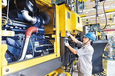 圖為山東臨工工程機械有限公司的工人在裝載機生產線上作業。