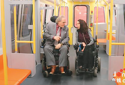 美國波士頓地鐵老乘客懷特先生坐著輪椅在橙線地鐵模型車上體驗。(圖片來源:國際在線)