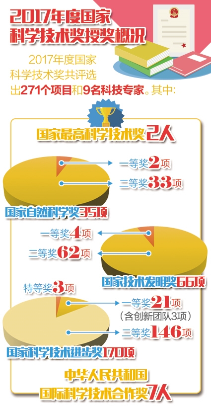 1月(yue)8日(ri),2017年度國(guo)家(jia)(jia)(jia)(jia)科學(xue)(xue)技術獎(jiang)(jiang)勵大(da)(da)會在(zai)北京(jing)人民大(da)(da)會堂隆重舉行。2名科學(xue)(xue)家(jia)(jia)(jia)(jia)獲得(de)國(guo)家(jia)(jia)(jia)(jia)最高科學(xue)(xue)技術獎(jiang)(jiang),271個項(xiang)目獲得(de)國(guo)家(jia)(jia)(jia)(jia)自然科學(xue)(xue)獎(jiang)(jiang)、國(guo)家(jia)(jia)(jia)(jia)技術發明獎(jiang)(jiang)、國(guo)家(jia)(jia)(jia)(jia)科學(xue)(xue)技術進(jin)步獎(jiang)(jiang)三大(da)(da)獎(jiang)(jiang),7名外籍專家(jia)(jia)(jia)(jia)獲得(de)國(guo)際合作獎(jiang)(jiang)。