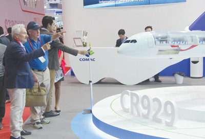中國(guo)商飛(fei)展示的(de)CR929客機模(mo)型(xing)吸(xi)引了(le)眾(zhong)多(duo)交易商的(de)目(mu)光(張志文 攝)