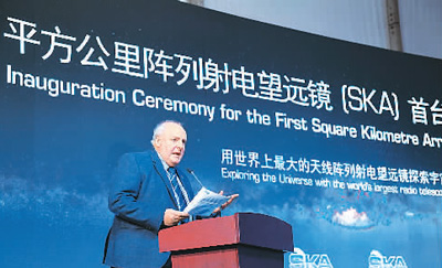 SKA組織總(zong)干(gan)事菲利普(pu)·戴蒙在首臺天線(xian)樣機出廠儀式上發言(新華社 發)