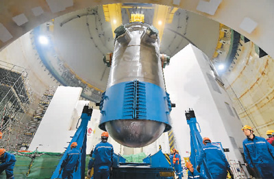 1月28日,華龍一號全球首堆、中核集團福清核電5號機組反應堆壓力容器順利吊裝。林善傳攝(新華社發)