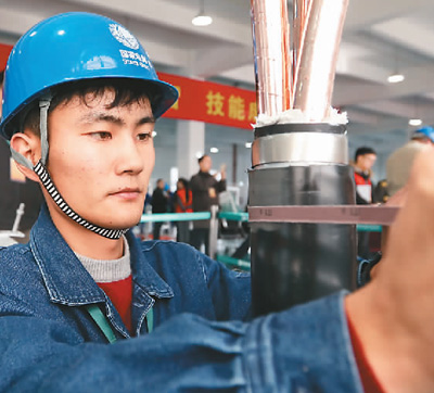 圖為2017年華東地區首屆10千伏電力電纜終端安裝技能比武大賽中,參賽選手在進行制作。(人民視覺 章勇濤攝)