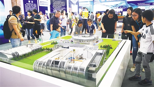 觀眾在全國科技活動周展廳參觀中國散裂中子源模型。