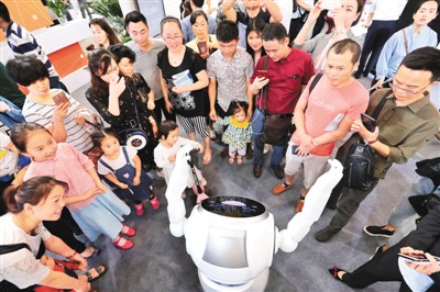 2018中國國際大數據產業博覽會上跳舞的小i機器人。(新華社記者 歐東衢攝)