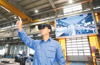 工作人員在中國商飛公司總裝制造中心使用AR眼鏡操控虛擬電子屏幕。(新華社記者 丁 汀攝)
