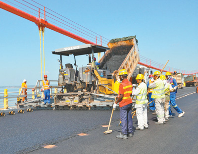 中國與莫桑比克員工進行橋面道路施工。(中國路橋公司供圖)