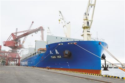 成功首航北極航道的“天惠輪”正在日本北海道釧路港卸貨。(記者 劉軍國攝)