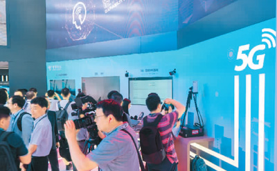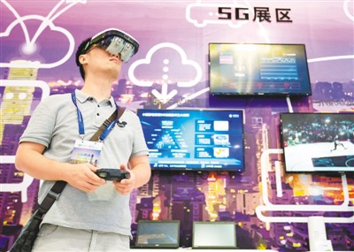 8月31日,在第十四屆中國(南京)國際軟件產品和信息服務交易博覽會上,參觀者參觀體驗5G展區。 (攝影 蘇陽)