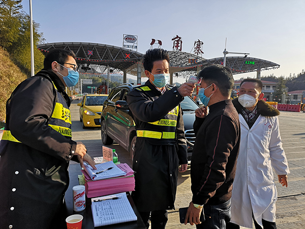 資興高速工作人員為過往司乘人員測量體溫。鄧名琴 攝