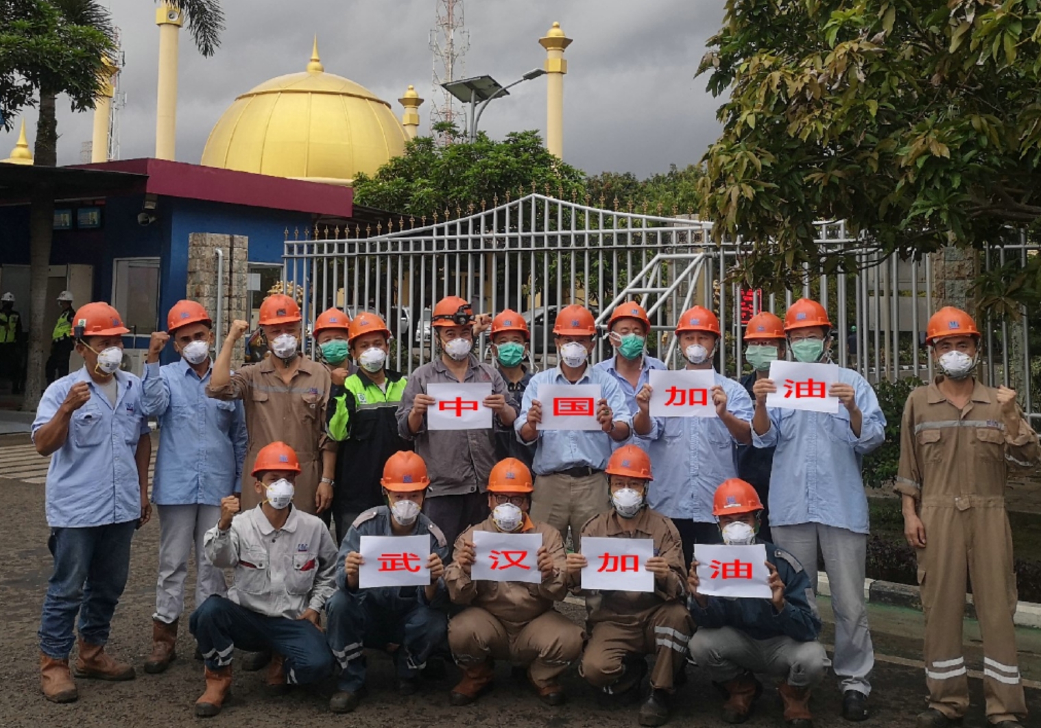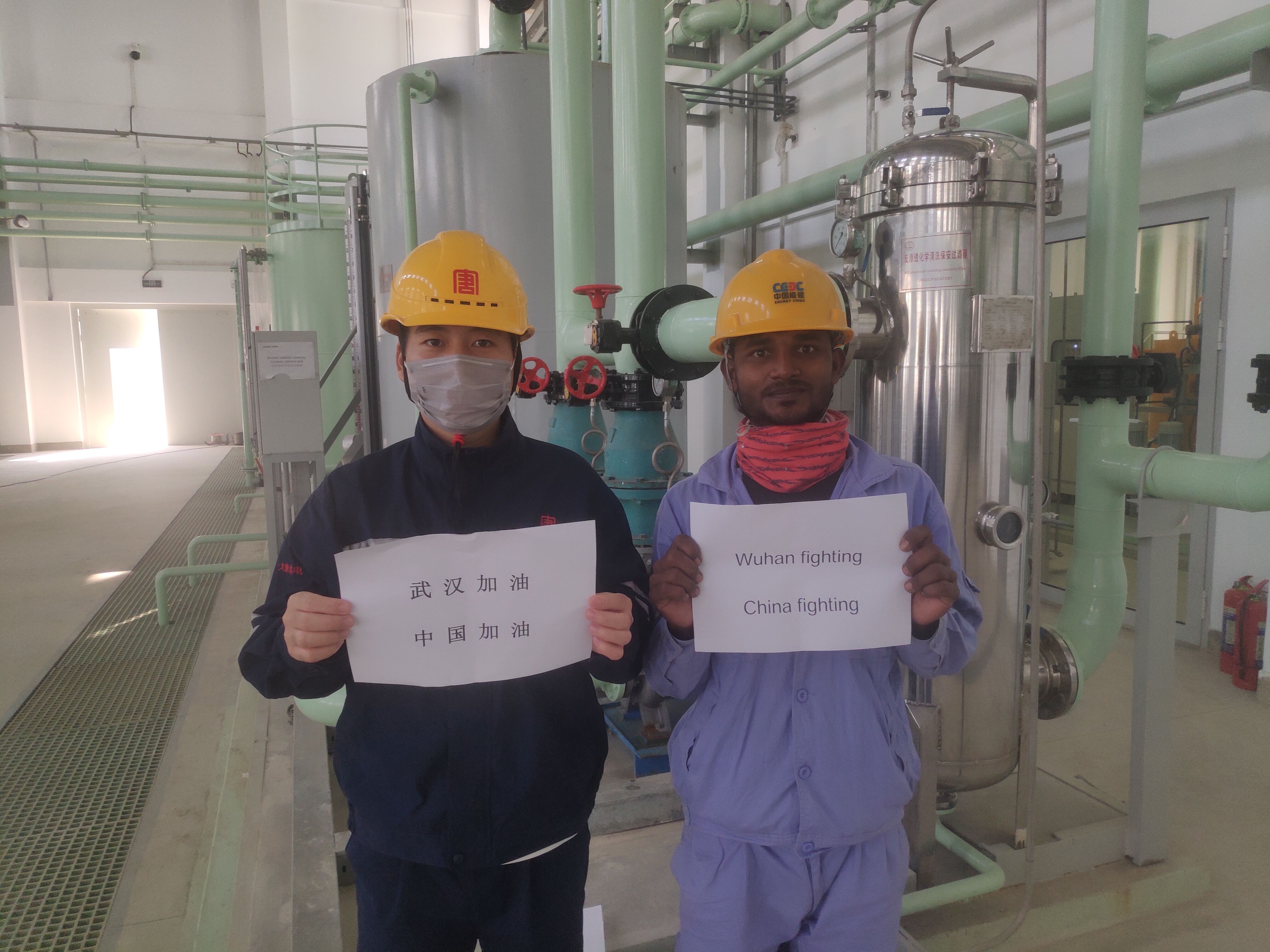 在中國大唐安徽發電公司承擔運維工作的印尼芝拉扎電站,中印雙方人員共同為中國加油,為武漢加油