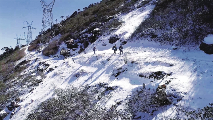 2月2日,巡線員工正在翻越碧羅雪山進行春節保供電特殊巡視