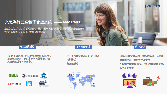 深耕語言(yan)服(fu)務(wu)25年,文思海輝在全(quan)球(qiu)27個城市(shi)設有(you)50個分(fen)支機構及交付(fu)中心(xin),擁(yong)有(you)6萬(wan)+活躍的(de)翻(fan)譯(yi)(yi)人才,能為(wei)全(quan)球(qiu)客(ke)戶提供200多種語言(yan)、7*24小時(shi)的(de)全(quan)球(qiu)化(hua)(hua)和(he)本地化(hua)(hua)服(fu)務(wu)。如(ru)何(he)保障如(ru)此龐大的(de)翻(fan)譯(yi)(yi)團隊高效運作(zuo)?文思海輝云端翻(fan)譯(yi)(yi)管理平臺——NeoTrans起(qi)到(dao)了核心(xin)作(zuo)用。