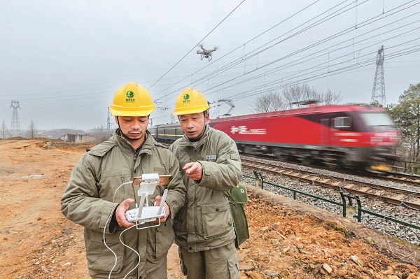 1月22日,湖北黃岡供電公司員工使用無人機在團風縣黃牽一回線附近巡視跨越京九鐵路的輸電線路。豐俊 攝