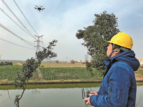 1月21日,江蘇泰州供電公司員工使用無人機巡檢供電線路。張鵬 攝